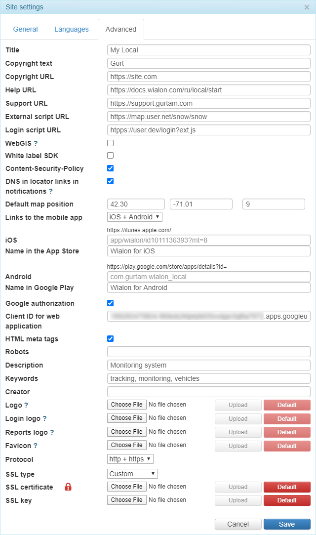 | Protocol | The protocol used (http, http + https, https). For the https protocol, you can add an SSL certificate and an SSL key. For an SSL certificate, indicate its type (Custom, Let's Encrypt, or Self-signed). In case of selecting Let's Encrypt or Self-signed, you do not have to upload the certificate yourself because it is generated automatically. To work using the https protocol, the site (Wialon Web or CMS Manager) indicated in the Base URL field on the General tab is also required to work with it (that is, either http + https or https should be selected in the Protocol field). |
