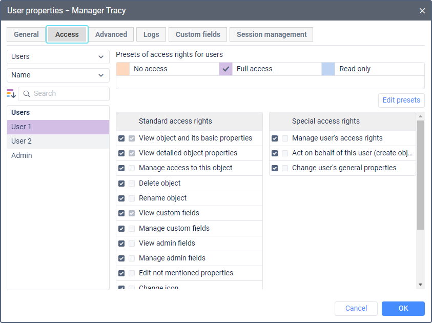 Standard rights are access rights related to the actions the user can perform with all macro-objects. There are 16 such rights in the system, for example: View object and its basic properties, Manage access to this object, Delete object, and so on.