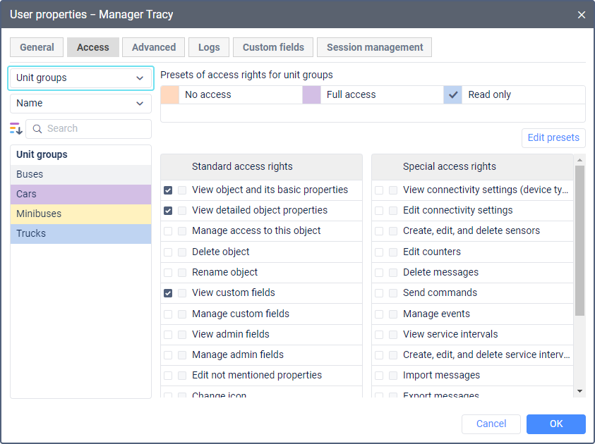 Manage custom fields | Allows creating, deleting, changing general custom fields in the properties of the group and its units. Also, allows editing the content of the Profile tab in the unit properties. This access right works only in combination with the previous one. |