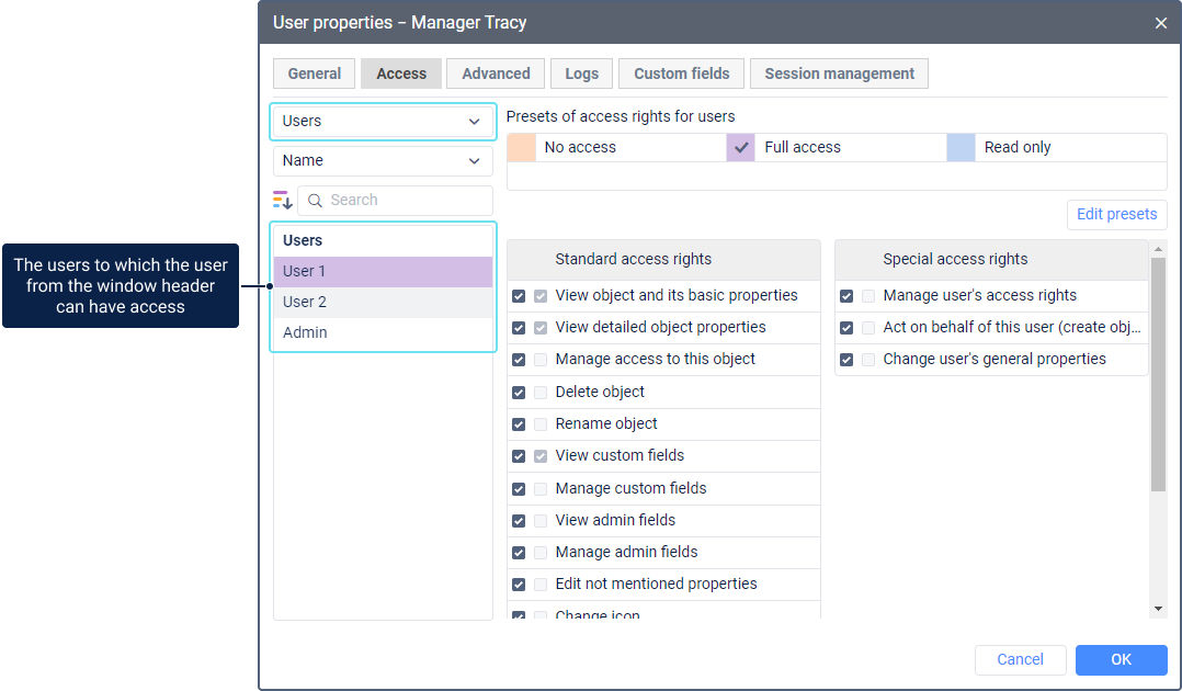 Manage access to this object | Allows seeing the user on the Access tab of the properties of other users, where you can configure access to this user. When transferring access rights, take the hierarchy rules into account. |