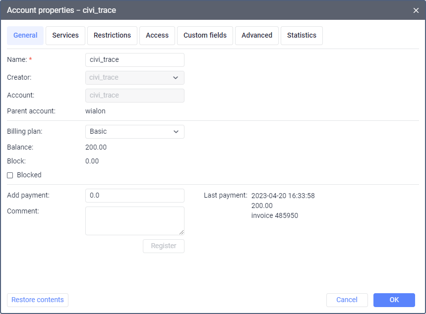 Account properties open when you click on the name of an account in the list. This window can display up to seven tabs, depending on your access rights to the account. It also contains the Restore contents button which allows you to restore the micro objects belonging to the account resource.