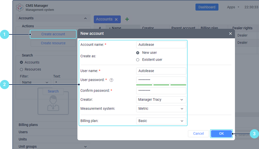 If the selected user doesn't have dealer rights, the Billing plan field becomes inactive, and it is impossible to create the account.