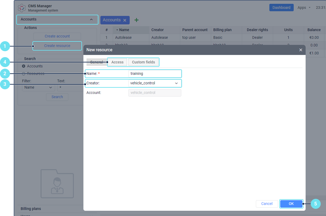 - the Resources service should be enabled in the properties of the account in which you want to create a resource.