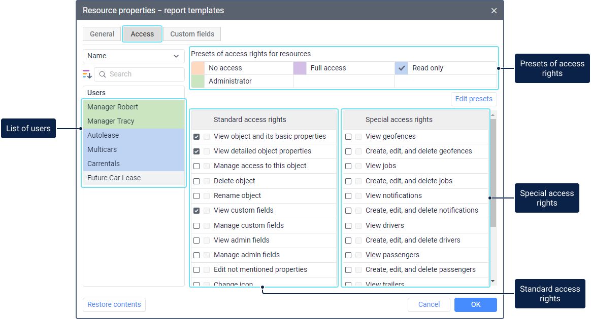 On this tab, you can see and change the access rights of users to the resource.