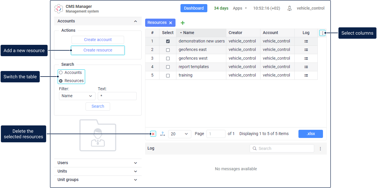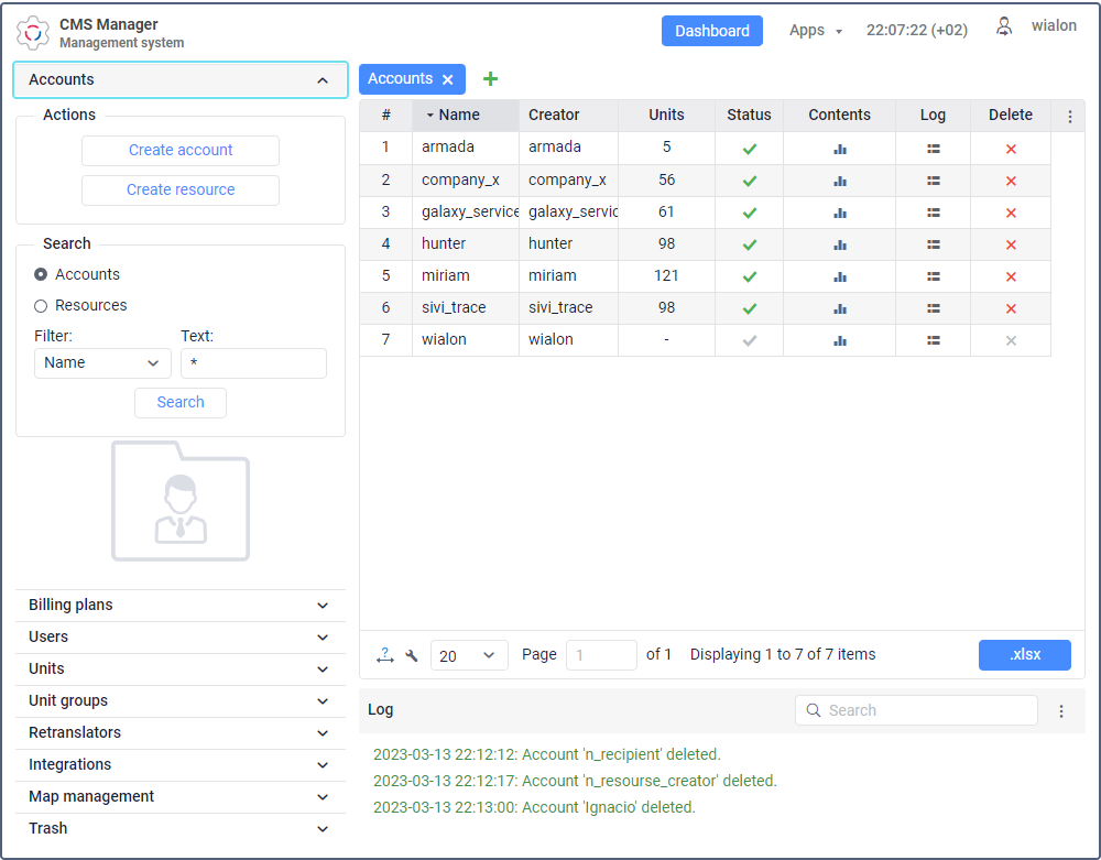 You can work with accounts and resources only in the management system (CMS Manager). To get started, open the Accounts section in the navigation panel.
