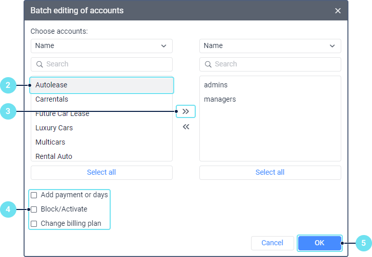 - Change billing plan. Allows you to assign another billing plan to the accounts.