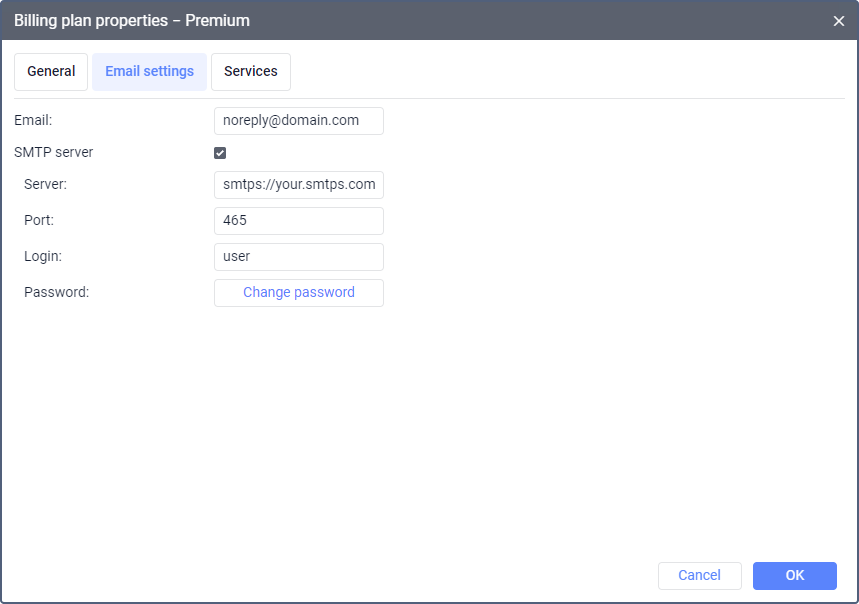 System messages can be sent using your SMTP server. To adjust this setting, enter the email address and activate the SMTP server option. Next, specify the server, port, login, and password. Make sure that the protocol (SMTP or SMTPS) is specified in the server address. Usually, ports 25 and 587 are used for SMTP, and 465 — for SMTPS.