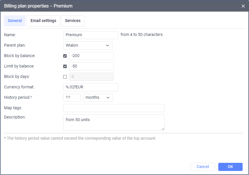 | Limit by balance | The balance state at which some services and access to CMS Manager should be disabled for accounts with this billing plan. This option works similar to the same-name option in the account properties. |
