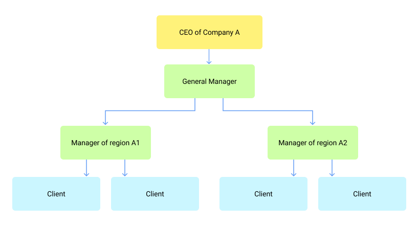 Company A provides satellite monitoring software to logistics organizations in regions A1 and A2. Separate managers deal with clients from each region. The managers of both regions are subordinate to the general manager who, in their turn, reports to the CEO of the company.