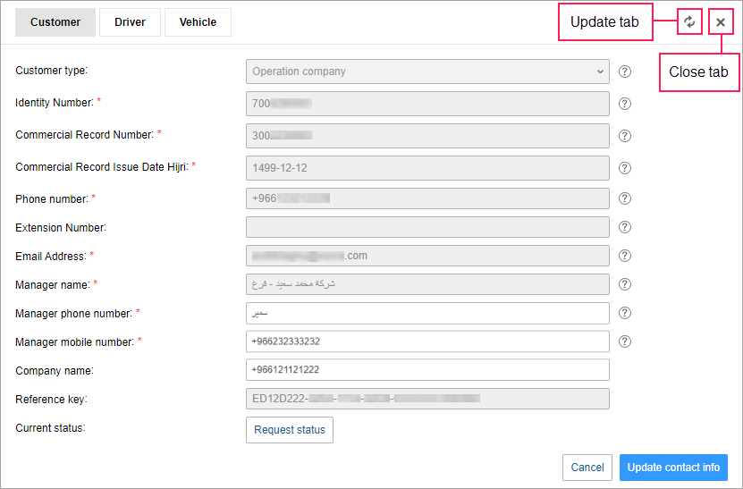 In the case of an operation company, you can edit the Manager name, Manager phone number, Manager mobile number fields. To do this, enter new data and click Update contact info. After that, a request is sent to the Wasl server. In case of success, the manager’s contact information changes.