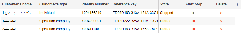 The table of customers contains information about the registered customers, the icon for stopping or starting data transmission, and the icon for deleting the customers.