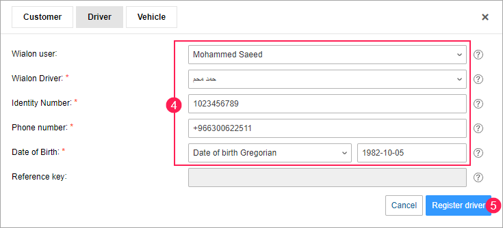 To transmit the drivers’ data to Wasl, you should register the drivers of your customer. The registration is possible only for the drivers created in your customer’s Wialon account.