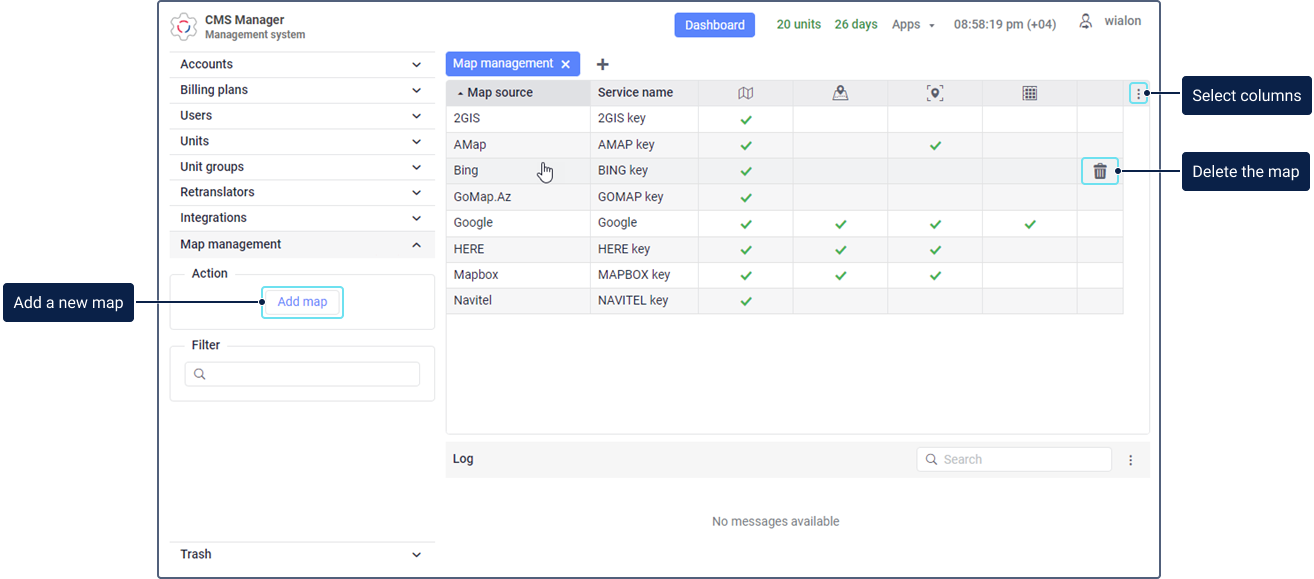 The Map management section is available only in the CMS Manager and for top accounts. In this section, you can add, edit, and delete maps. A standard table contains all the added maps that can be used as basemap, routing source, geodata source, and distance matrix. The available services of the map are marked with the icon