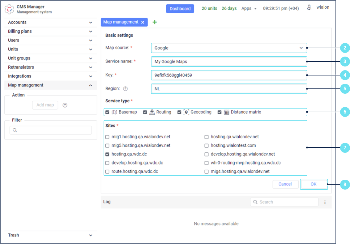 Key* | The API key purchased to connect the required map source. For some maps, a free API key can be used. In this case, you can get it on the website of the required service. The Key field is required when selecting the following map sources: AMap, Google, HERE, Kosmosnimki, Mapbox, MyIndia, Namaa, Navteq, OpenWeatherMap, Sygic, Trimble, Visicom, What3words, Yandex. When selecting the Custom map source, the Key field is available, but is optional. |
