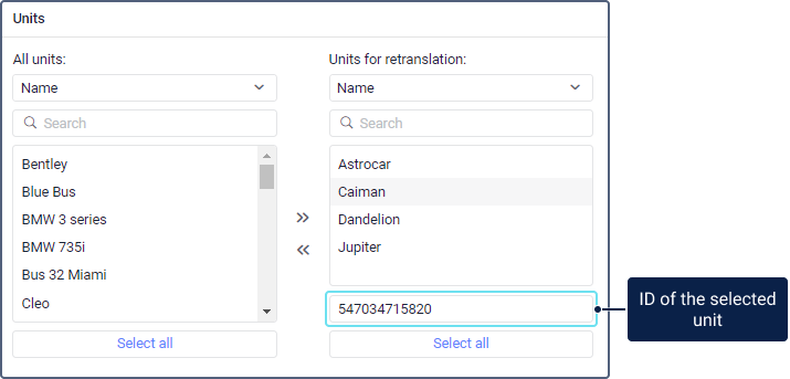 In this section, select units for data transmission. To do this, select the necessary ones in the All units list and move them to the Units for retranslation list using the icon . To select all the units at the same time, click Select all. You can also use keyboard shortcuts to select all or several units at once. To add one unit for data transmission, just double-click on its name.