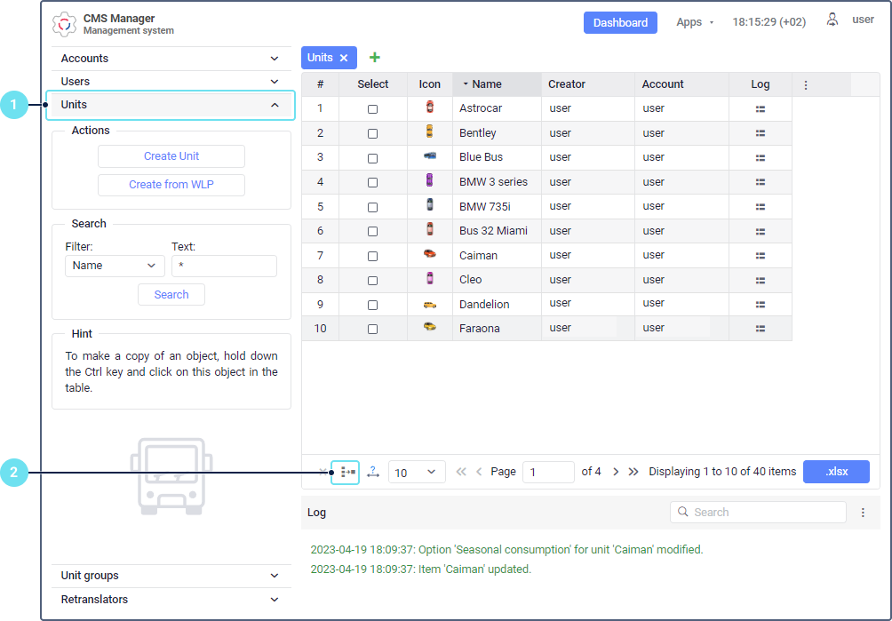 In the left list, select units you want to transfer to another account. To find the required unit, use the dynamic filter above the list.