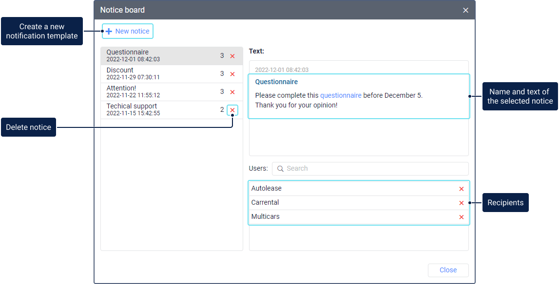 If there are sent notices, you can see their list in the left part of the window. Each line contains the notice name, the date and time of its sending, and the number of recipients.