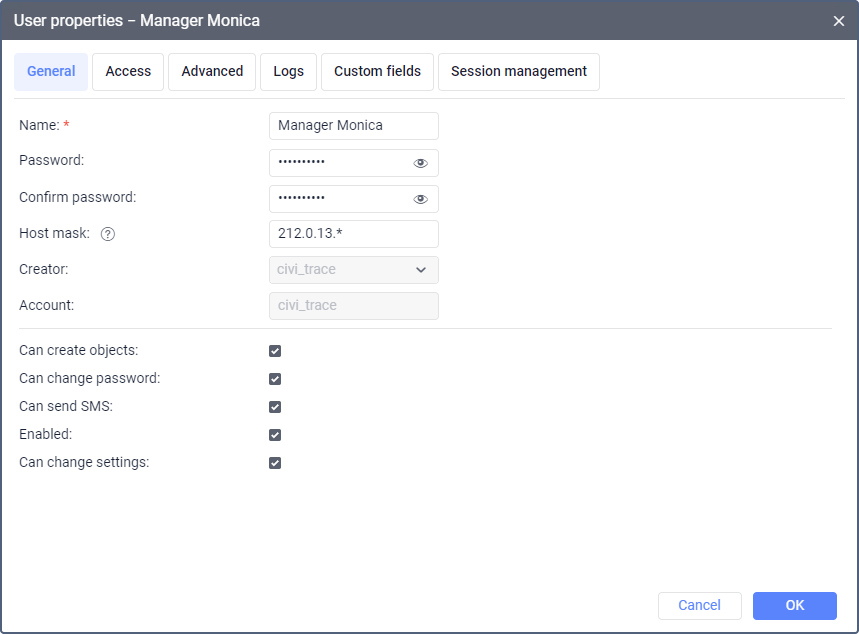 The window of user properties is shown when creating, editing, and copying a user. In this window, you can specify different user parameters, configure access to the user, view logs, add custom fields, etc.