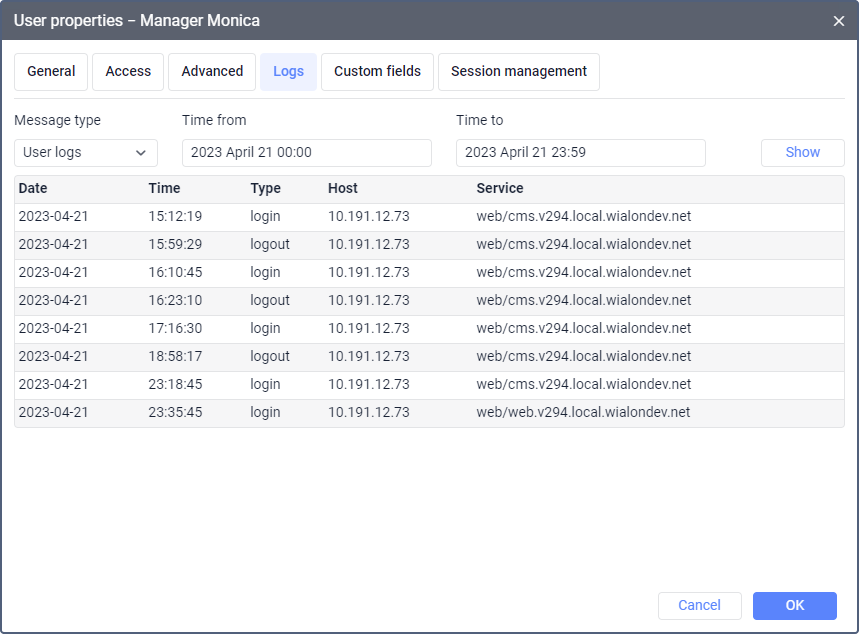This tab contains a table which shows how many times the user has logged in or out of the system. To request data for a specific period, select it in the calendar and click Show.