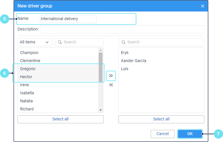 Select the drivers which should belong to the group. To do this, select the required ones in the list on the left and move them to the list on the right by clicking on the icon