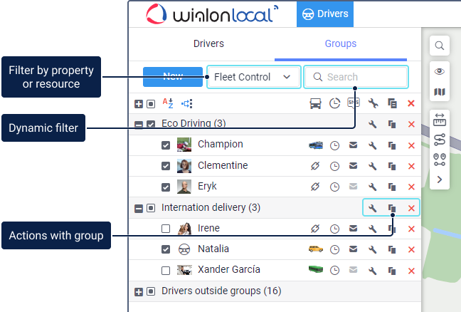 Expand the row of the group to see the drivers belonging to it and perform actions with them. To see the drivers from the group on the map, select this group in the list.