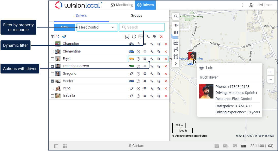 . To quickly find the required driver, use the dynamic filter or the filter by property (assigned or not assigned drivers) or by resource.