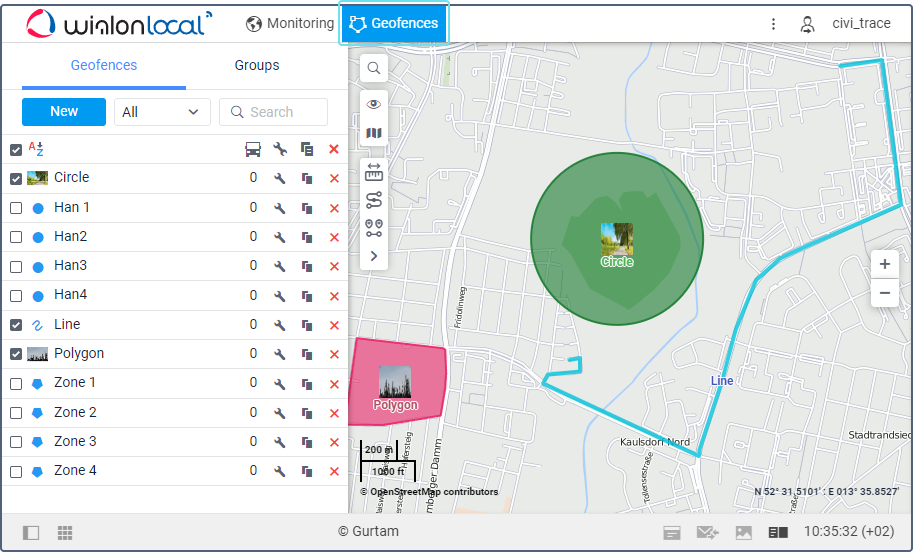 To go to the Geofences tab, click on its name in the top panel or select Geofences in the main menu customizer. On this tab, you can create geofences and their groups, edit, copy and delete them (see Managing geofences).