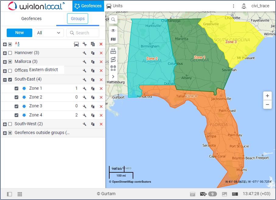 Next to the group name, the number of geofences belonging to it is shown in parentheses. The geofences which don’t belong to any group comprise a separate group called Geofences outside groups. The tooltip of the group displays its name, resource, and the names of the geofences included in the group.