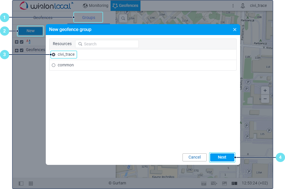 . To quickly find the required geofence group, use the dynamic filter or the filter by property (polygons, lines, circles) or by resource.