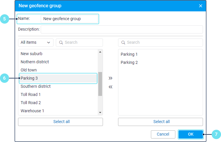 Select the geofences you want to add to the group. To do this, select the required ones in the list on the left and move them to the list on the right by clicking on the icon