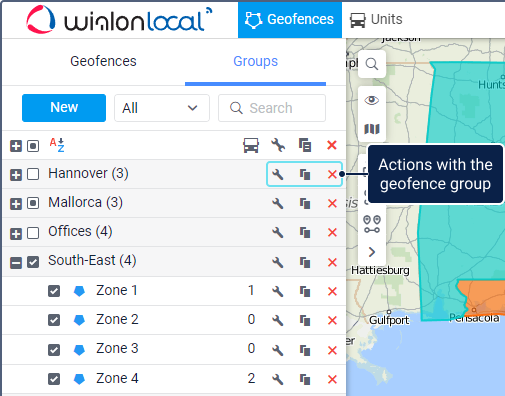 Expand the row of the group to see the geofences belonging to it and perform actions with them. To see the geofences from the group on the map, select this group in the list.