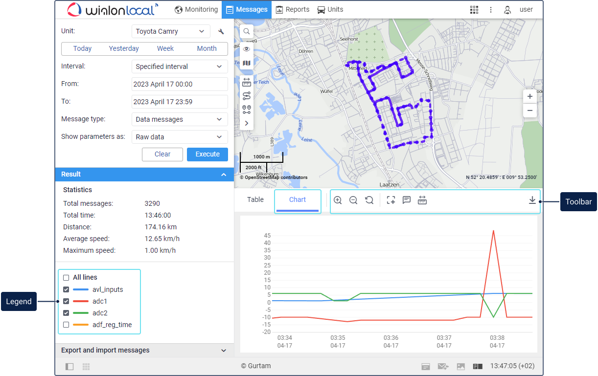 After querying messages, the track of the unit is displayed on the map.