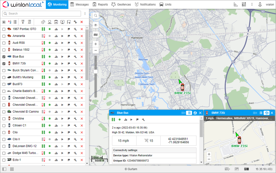 Double-click on the unit name in the work list of the Monitoring tab. In this case, the map centers on the selected unit.