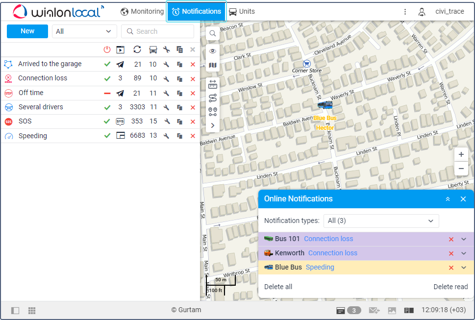 Using notifications in the monitoring system, you can control unit movement, sensor readings, driver and trailer assignments, and so on. If a notification is triggered, the following actions are possible: