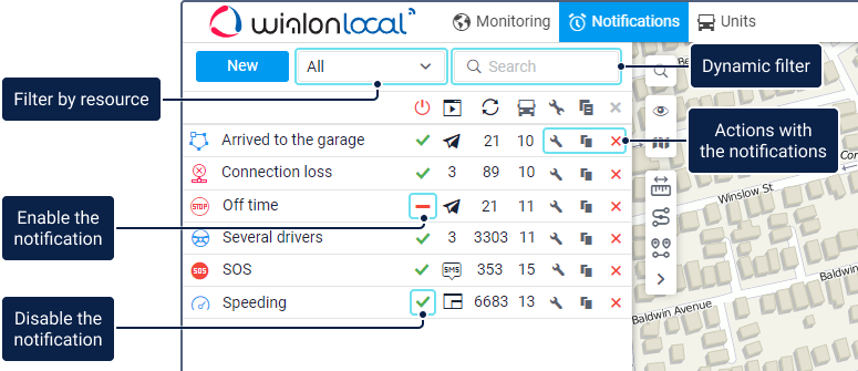 On the tab, you can see a list of all the available notifications. Above the list, there is a button for creating notifications, a filter by resource and a dynamic filter.