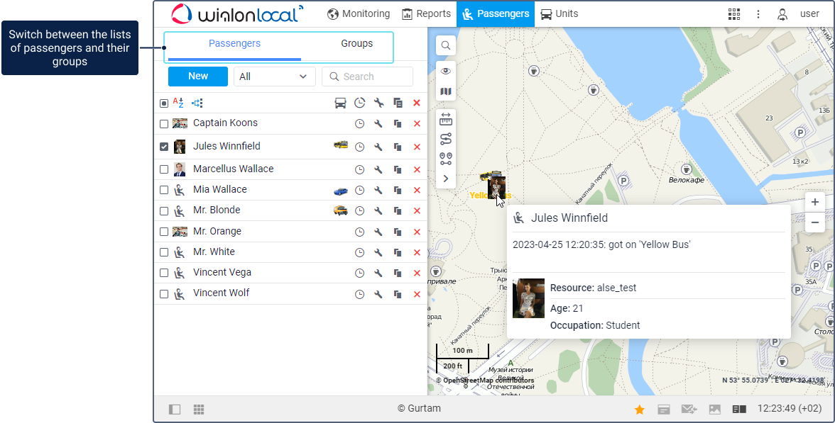 On this tab, you can create passengers and add them to the lists of automatic assignment to the required units. This allows monitoring the trips of passengers and use the data received from them when monitoring units, executing reports and configuring notifications (see more). Here you can also perform the following actions with passengers: working with the assignment history, editing the properties, copying, and deleting.