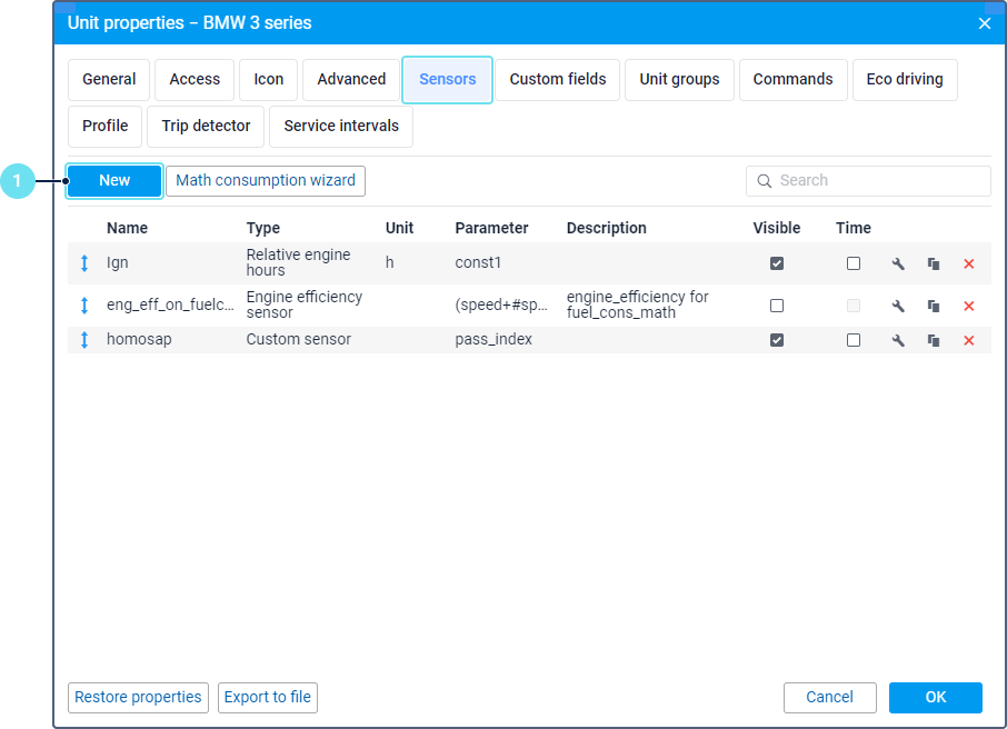 For all the units, to which you want the passengers to be assigned automatically, create a sensor of the Passenger sensor type. The sensor parameter depends on the device you use and its settings.