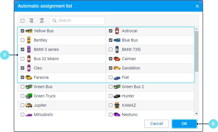 Select the units or unit groups to which the passengers of the selected resource should be assigned automatically. To switch between the lists of units and their groups, use the icon
