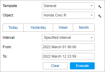 Select the system object that you want to execute the report on (the current user should have the Request reports and messages access right). Depending on the report type specified in the template, you can select a unit, unit group, user, driver, trailer, route, resource, retranslator, group of drivers or trailers, passenger or group of passengers. For the Unit group report type, you can specify more than one object. Click on the Add object button (