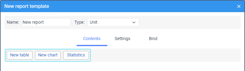 On the Contents tab, you can add tables, charts, or statistics to the report template.