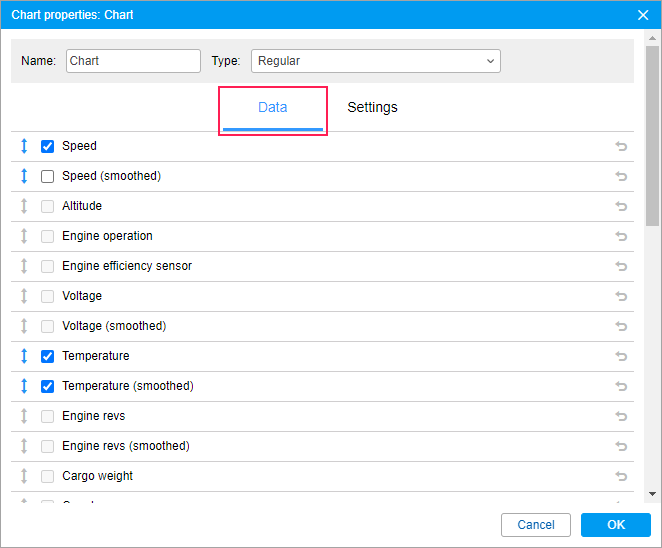 On the Data tab, you can select the lines that should be displayed in the chart. The selection is only available for charts of the Regular type.