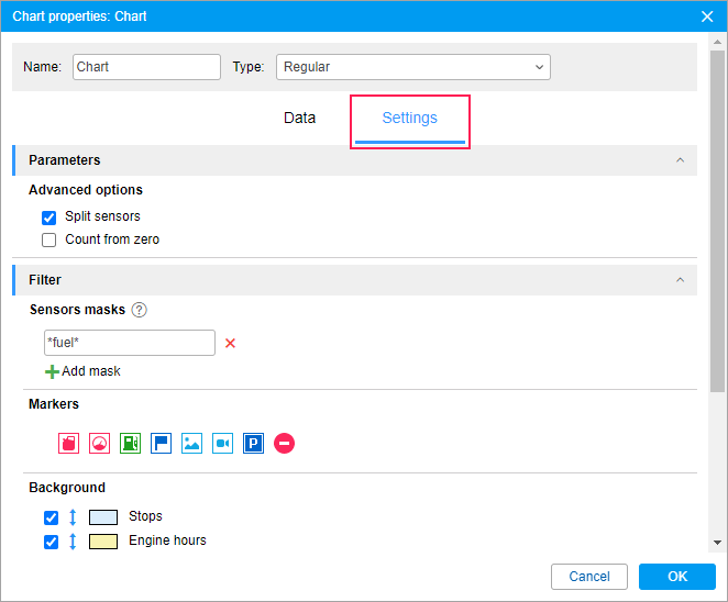 The intervals of such events as stops, parkings, trips, connection losses, and work of engine hours can be used as a chart background. Using these backgrounds you can correlate a chart value and an interval to which it corresponds. Different colours can be assigned for the event intervals. To select a colour, click on the colour box, choose the colour from the palette and click OK.