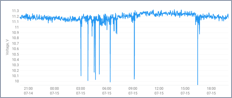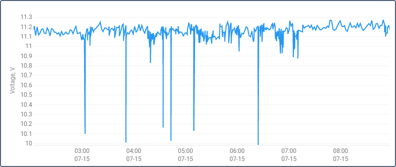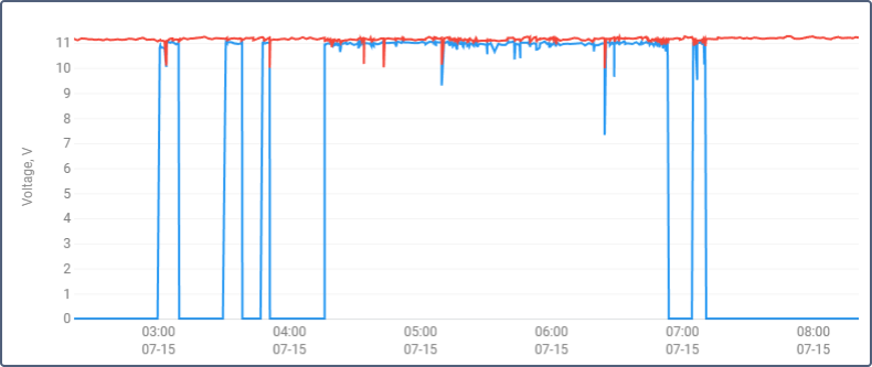 The image below shows an example of two voltage charts for the same unit within the same time interval. The first chart is regular, the second — with the Count from zero option turned on.