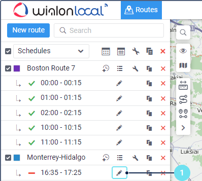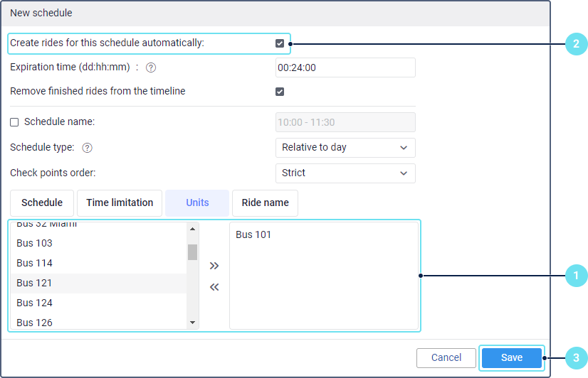 Subsequently, you can enable and disable the automatic creation of rides using the icons / next to the schedule name. Rides are created automatically when the time before the scheduled time of arrival at the first check point is equal to the number of minutes specified in the variation field. If several units are specified, the one that leaves the geofence of the starting route point first is assigned to the route, regardless of the selected order of check points. |