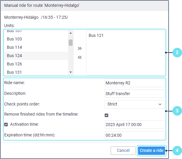 Parameter Description Ride name* The name of the ride. It should contain at least 4 characters. When filling in the field, take into account the input rules. Description The description of the ride. Check points order* The order of check points the driver should stick to when performing the ride. See more. Remove finished rides from the timeline When this option is enabled, rides disappear from the timeline after their completion. It is advisable to enable this option so that only active rides are shown on the timeline, which makes it easier for you to track them. Activation time The time when the system should start tracking the ride. If it is not specified, the ride starts to be tracked when the unit arrives at the first point (if the strict order of check points is selected) or to any point (in other cases). Expiration time* The time (days:hours:minutes) after which the ride should be forcibly terminated and receive the Aborted status. This time is counted beginning from the ride creation. The default value is 24 hours. -