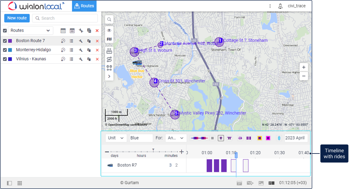 The timeline on the Routes tab allows you to track rides in real time. The timeline shows the rides in progress and all the rides created manually.