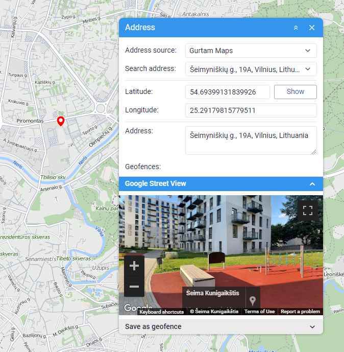 This tool is designed to search for places on the map and determine the address of points. It also allows you to save the marked place as a geofence.