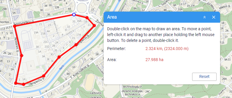 This tool allows you to determine the perimeter and area of the territories marked on the map.