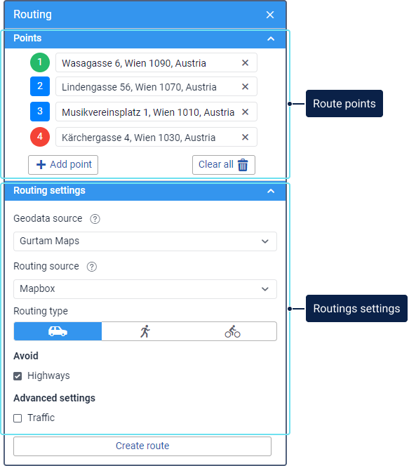 To open the tool, click on the icon  in the tool menu on the left of the map. To plan a route, you should select the route points and specify the routing settings.