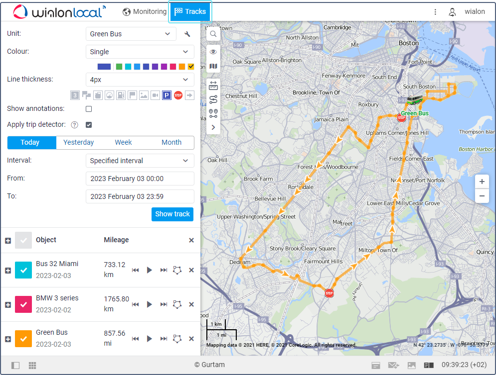 To go to the Tracks tab, click on its name in the top panel or select the item of the same name in the main menu customizer. On this tab, you can view unit tracks and work with them. You can enable markers on tracks to see the places where stops, speedings, fuel fillings and thefts, etc. have been detected.